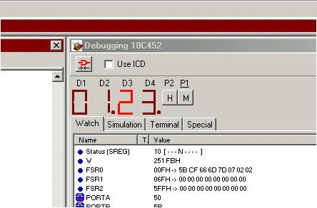 Here is a screen shot showing a multiplexed 7 segment display with 2 pushbuttons connected to a WIZ-C application, note that the display shows the lit digit in bright red, but the unlit digits are shown in a dull colour, this simulates persistence of vision with multiplexed displays. Also shown are two push buttons.
